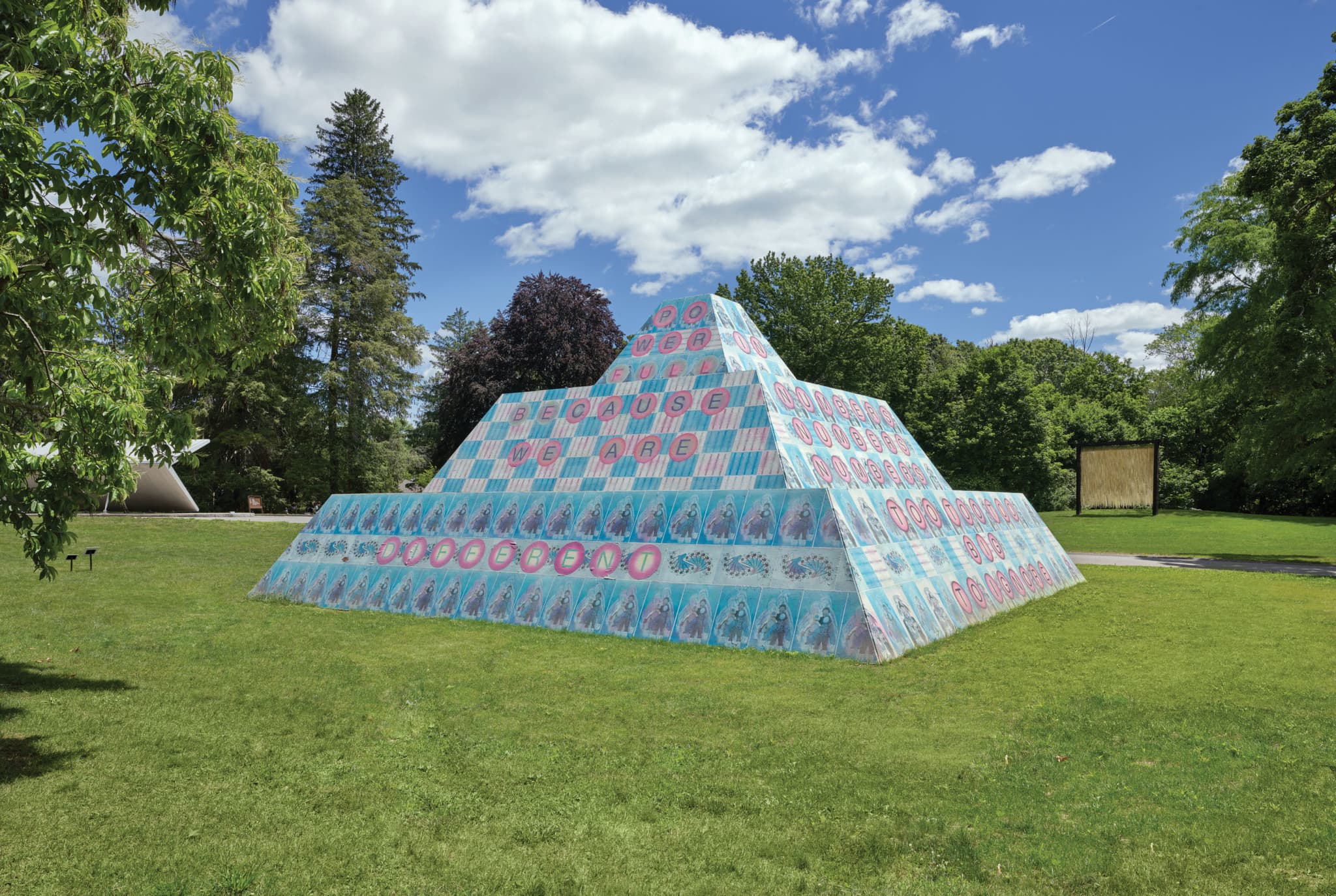 Jeffrey Gibson, Because Once You Enter My House, It Becomes Our House, 2020/2021. Plywood, posters, steel, and performances, 44 × 44 × 21 ft. Originally commissioned by Socrates Sculpture Park, New York. VIA Art Fund is the commissioning sponsor. Photo by Julia Featheringill.