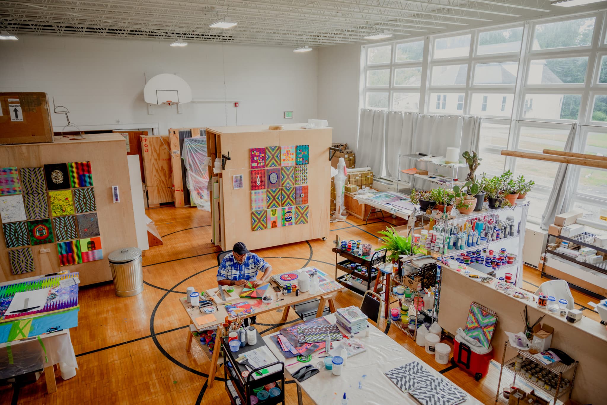 The largest workspace is situated in the old gymnasium where lacquered floors and a basketball hoop remain. Photo by Mel Taing.