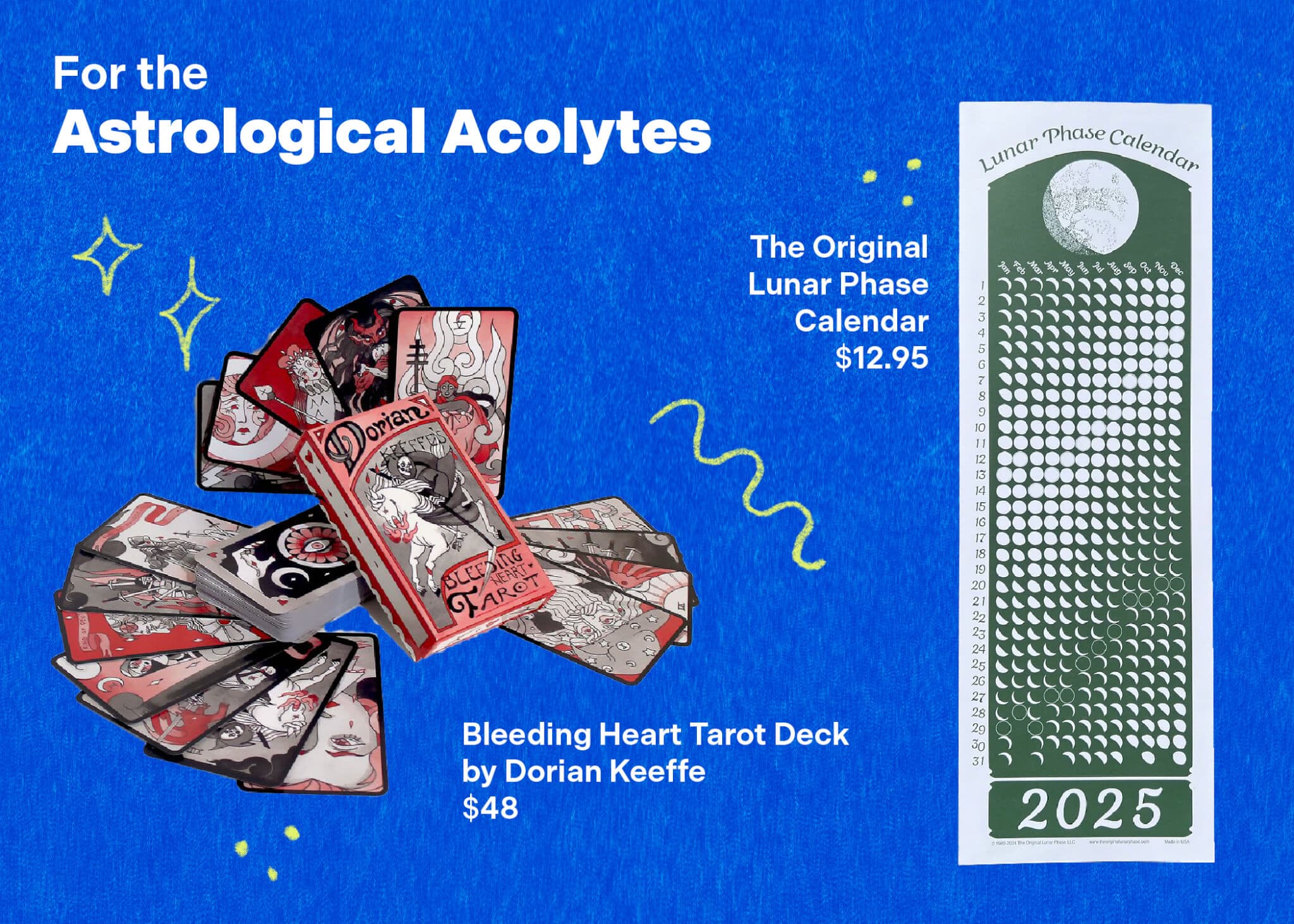 Local artist Dorian Keeffe began this years-in-the-making project as a Valentine’s Day gift, but when the relationship didn’t last, they kept at it, creating seventy-eight original watercolors that nod to classic tattoo flash, mythology, queer culture, and other influences close to their heart. Reproduced in a tarot deck available at 13FOREST, the RISD alum’s arcana should make a great gift for your favorite occultist or anyone looking to reflect on the year ahead.