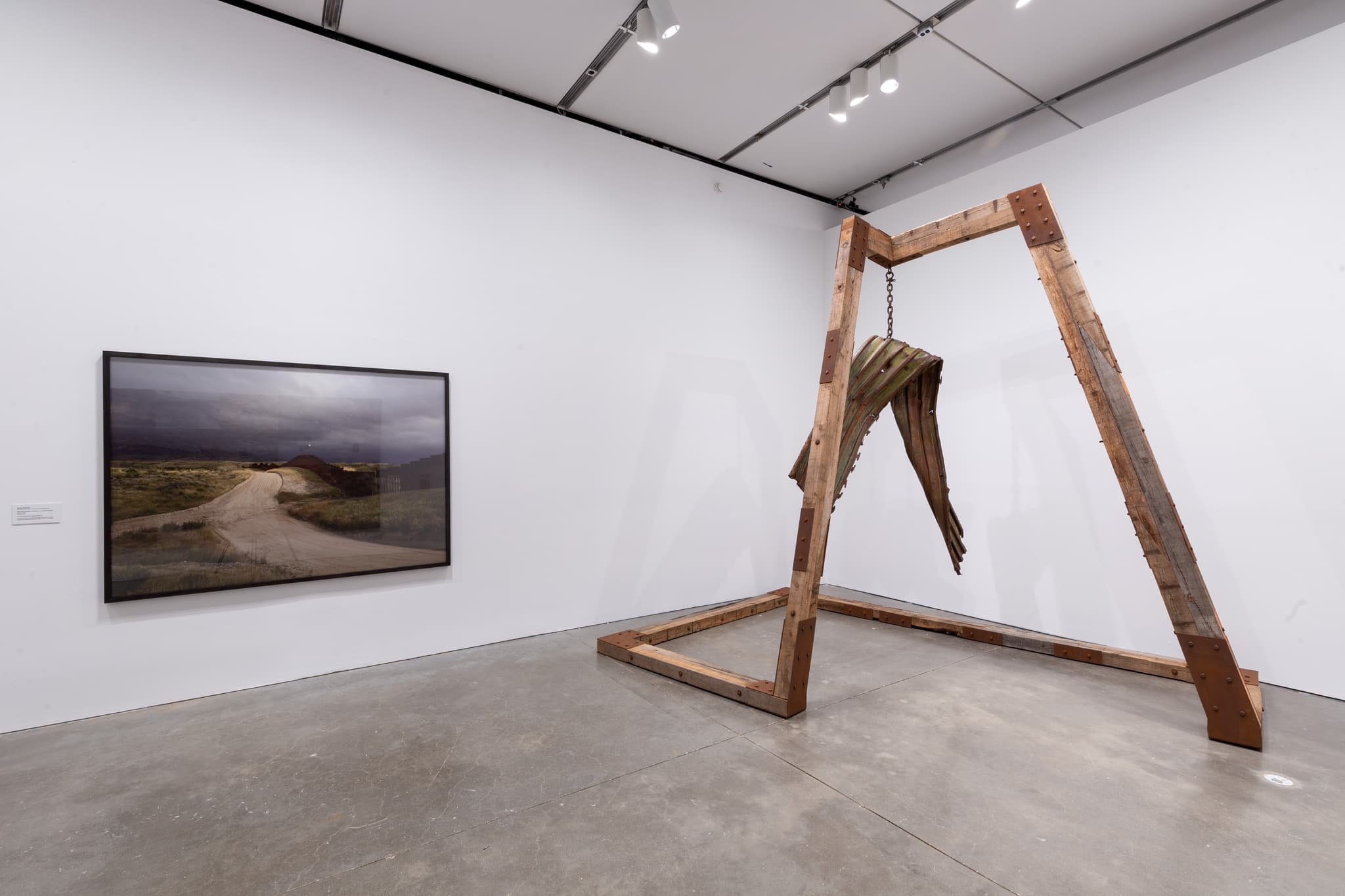 While Misrach documents debris, Galindo transforms it. His sound sculpture “Ángel Exterminador/Exterminating Angel” (2015) reimagines a piece of the Mexico-US barrier as a musical instrument, bringing lightness to weighty materials made heavier by history. Before it was deployed at the border, the twisted hunk of metal at the center of the work served as a helicopter landing strip during the Vietnam War. Now it’s a gong suspended from a repurposed drag chain, used by Border Patrol to sweep away the day’s old footprints so they can better track new ones. It all hangs from a gallows-like scaffold of wood blocks used in the construction of the border barrier.
