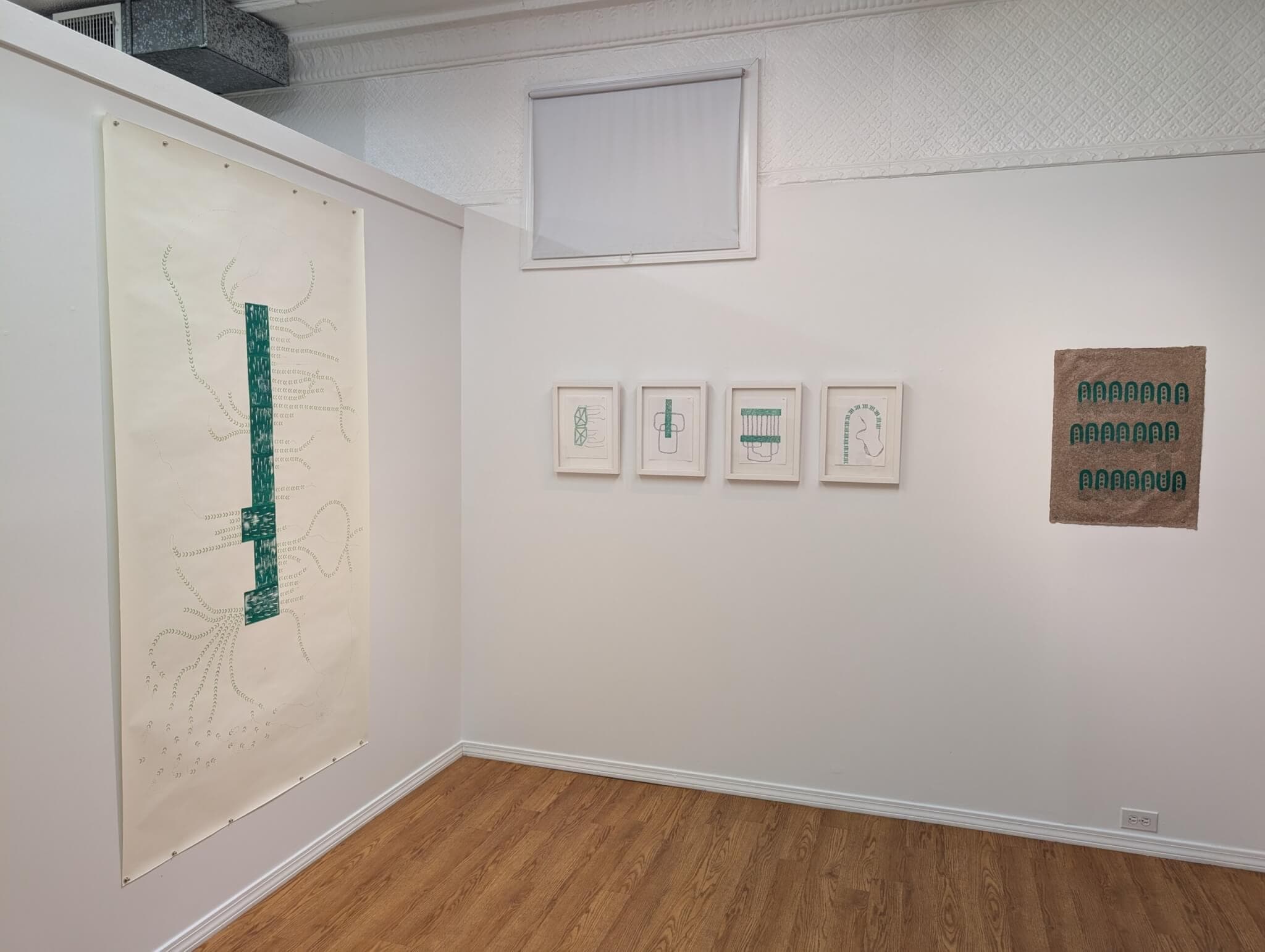 Atukọ̀ is the Yorùbá word for navigator, and at Drive-by Projects’ storefront gallery, Fúnlọ́lá Coker’s drawings and sculptures are positioned as tools for wayfinding where lines are carved, stamped, and dotted into meandering paths. Some of the drawings are exercises from a 100-day practice with numbers in the top right corner (days 72, 74, 75, etc.). Bright green block print patterns evocative of indigo-dyed patterns of àdìrẹ eleko cloth anchor the composition while black dashes and dots move between the shapes with winding or geometric paths. Others feel more precious—a series of five drawings on handmade paper reveal tiny bits from the artists’ hair dancing across the weave of the page. Coker is a masterful sculptor with an expertise in metal casting (a spindly steel and alabaster sculpture resembling a delicate coatrack stands coyly in the window), but here, a different side of the artist is revealed where pen meets paper.  —Jameson Johnson