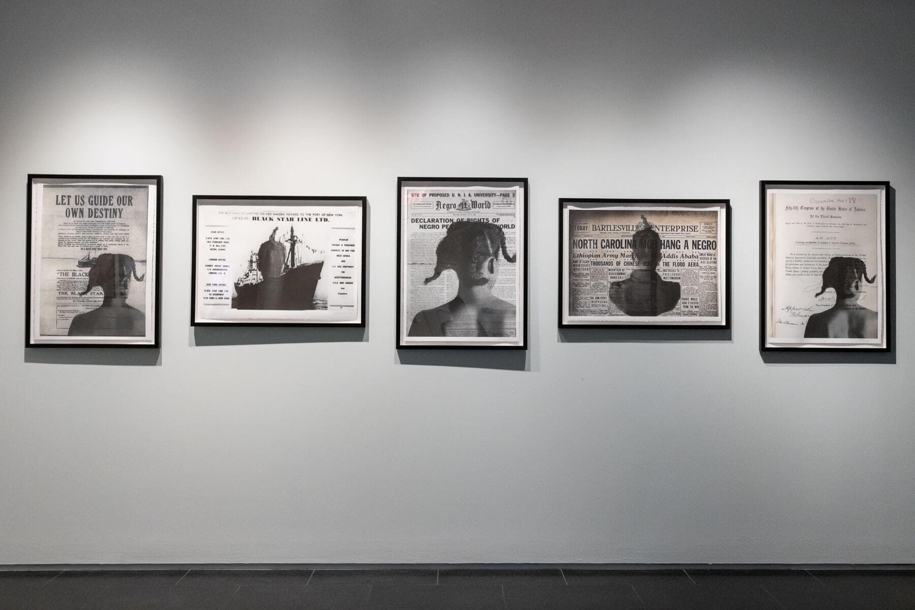 In the back rooms of the gallery, artist Adama Delphine Fawundu makes her own dive into archival material, focusing on Black women as witness. Five individual works use enlarged archival documents including newspapers, advertisements, and the act to increase Harriet Tubman’s pension superimposed onto anti-portraits by, and of, Fawundu. Her figure is positioned with the back of her head to the viewer, challenging the viewer to interpret from the perspective of a Black woman. Bold lettering in one advertisement for the prominent figure of the early twentieth-century Pan-Africanist movement, Marcus Garvey’s Black Star Line reads “LET US GUIDE OUR OWN DESTINY,” urging Black people to elevate the race by investing in his shipline. Just above Fawundu’s figure that document reads “DO A MAN’S PART NOW.”