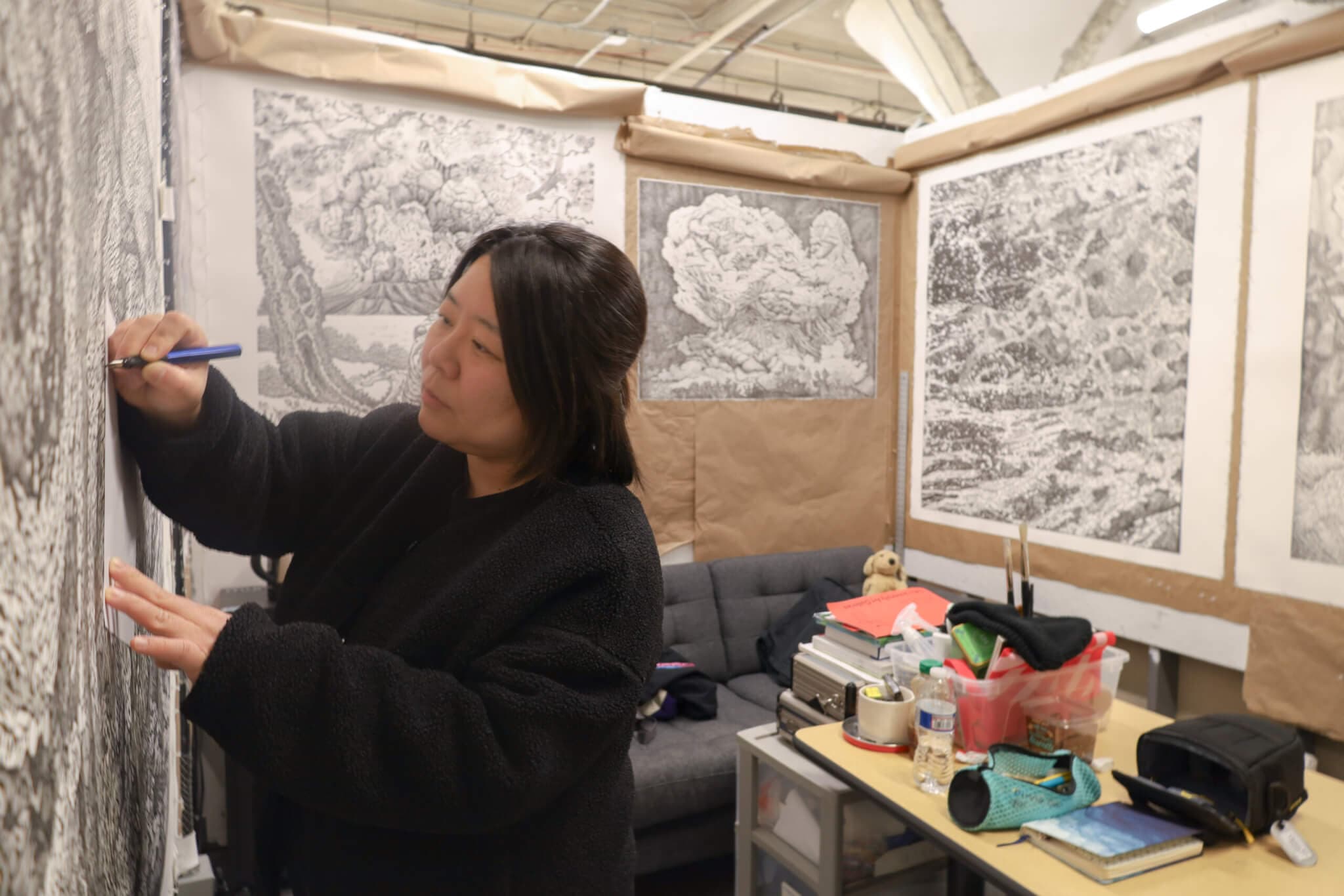 At Tufts University, MiJung Yun is one of approximately eighty SMFA students participating in the Open Studios event. Yun’s large abstract drawings cover the wall space in the orderly, brightly lit studio. Two plushies are curled on the grey couch in the corner, belonging to Yun’s daughter, who frequents the studio. Her daughter appears in a nearby self-portrait; they’re both depicted as tigers (the daughter as the cub, of course). This piece is featured in Yun’s Volcano series, which she began creating using inexpensive ninety-nine-cent pens, often received for free at conferences, which were later swapped for Micron and ink pens for longevity.