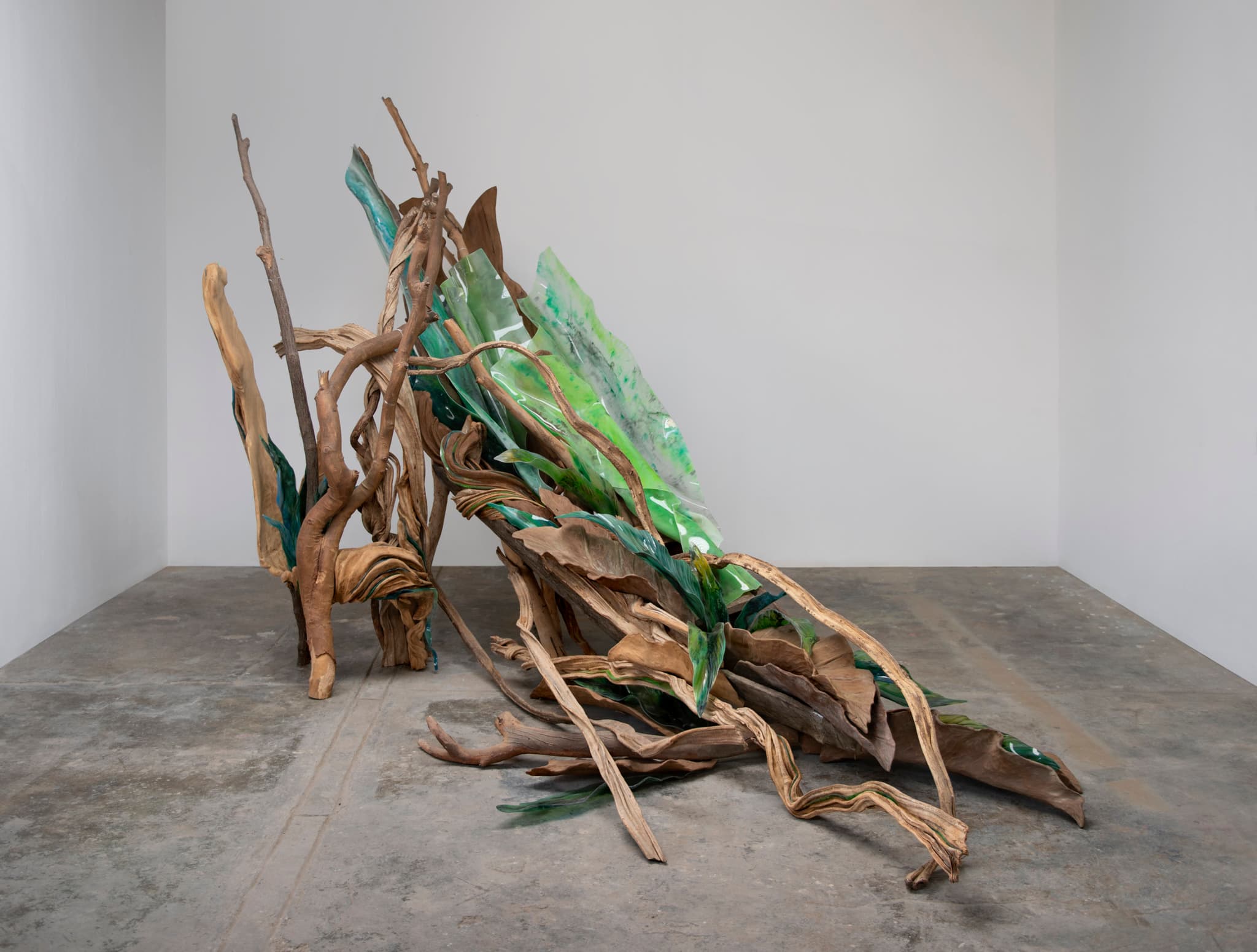 Estefania Puerta, Medicina Fantasma, 2021. Foam, aluminum leaf, epoxy, silk, glass, plant, latex, pastel, oil, ghost pipe tincture, plaster pulp. Courtesy of the artist and deCordova Sculpture Park & Museum. Photo by Sam Simon.
