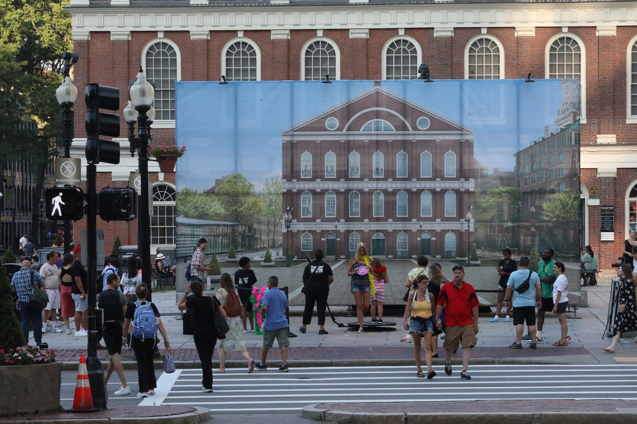 Statues and monuments have become subjects of contentious and reparative dialogues as we consider the impact of symbols and stories in public space. Conceptual artist Juan Obando has frequently worked with screens and banners to playfully and critically prod at social and cultural phenomena. At Dock Square, in front of Boston’s Faneuil Hall, Obando erected a photorealistic mockup of what the busy plaza might look like without a towering statue of Samuel Adams. The resulting installation bore a resemblance to the screens that sometimes pop up around construction projects, and at certain angles, a visitor might not even realize what was missing from the scene. Presented by Now + There, the “set” invited audiences to snap photos and insert their voice into the dialogue but also offered a stage for community programming throughout the summer. While the installation certainly provided a prompt for our community to reimagine monuments in public spaces, we are left to consider what comes next for contending with our city’s sometimes fraught histories. —Jameson Johnson