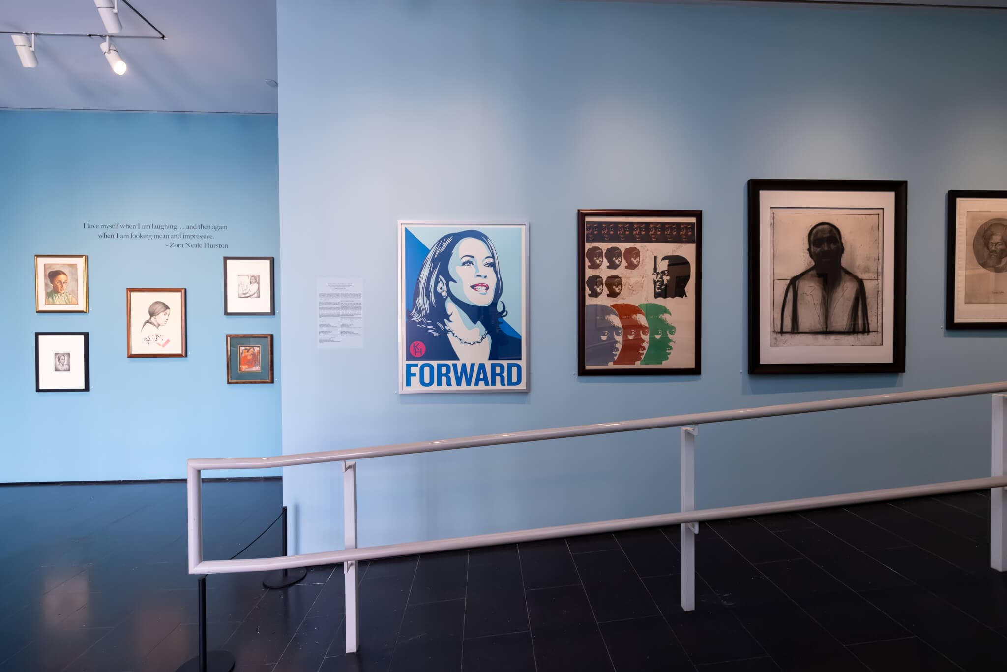 The exhibition moves with deliberate purpose, establishing a flowing spatial dialogue. Past the primary hallway, visitors will find a dedicated corner showcasing material culture from the Harlem Renaissance, enhanced by the surrounding presence of works by Romare Bearden. Bearden, the preeminent collagist of the twentieth century, stands as a notable bridge figure, as his work transforms vernacular life into high modernist expression. His method, which fragmented and reassembled images from Black life, and included musicians, urban scenes, and Southern rituals, perfectly embodies the Renaissance spirit of creating a whole, self-defined image from disparate, often damaged parts. However, in these intensely visual galleries, the experience of close looking is occasionally challenged by the physical presentation. While the thematic organization is impeccable, one notes the substantial, block-like interpretive panels, necessary as they are for context, sometimes compete with the delicate presentation of the artworks. For instance, along the preliminary walkway of political campaign posters and lithographs preceding the Bearden room, a large block of wall text positioned at the start of the hallway provides information for the entire sequence of works, including Shepard Fairey’s offset lithograph Kamala Harris (2025). After walking the length of the hallway, visitors must then return to the beginning to locate the label information, forcing a disjointed viewing experience that disrupts the natural flow of looking and learning.