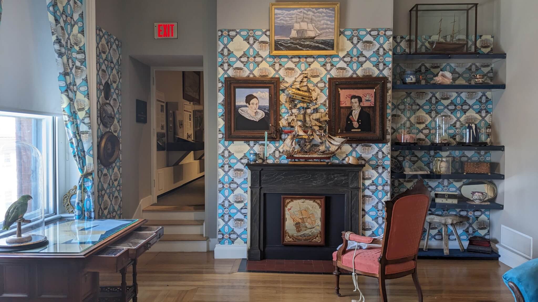 Smith Corby’s strong painterly range bridges varied styles of realism, setting herself apart from many artists by making her paints. She painted a faux bois pattern on a load-bearing column in the center of the gallery. A raised wooden floor surrounds it, creating the effect of a ship deck. On one wall, beside a fireplace, shelves hold a combination of museum collections and smaller works Smith Corby and Pettit created. A standout object is an ostrich egg Smith Corby painted after one in the Whaling Museum’s collection. Under the banner “NSSE,” an acronym for the exhibition’s title, two ships meet at their figureheads, the point marked by a little heart.