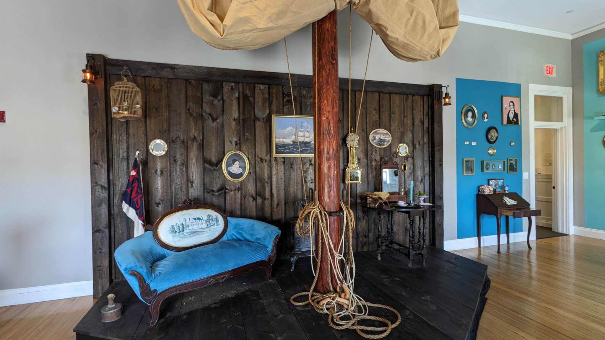 The things the artists made, collected, and integrated from the museum collection aesthetically blend together, yet the point of their endeavor is not to trick the viewers or to create riddles to be solved, although it could be approached this way. Rather, it appears that they sought a way to collapse time to plumb one of life’s greatest mysteries—how we cope with the absence of a person who we adore. Smith Corby and Pettit’s process included reading letters to each other of a couple parted by the sea, a recitation that enabled them to get close to the voices of the shorebound wife and the seafaring sailor. One of the letters included a note that it was the last message ever received from the sailor. Copies of the letters appear on a desk by a window with a beautiful view of the ocean framed by a cobblestoned street and square brick buildings from which vintage business signs hang. Looking beyond the land-bound scenery, the ocean glows a vivid blue. Like many before me, I watched the water instead of embracing my loved one. The fathomlessness of the ocean can be compared to the potency of true love, yet this is also what separates people. The oppositions—beauty and danger—are tethered with a constancy that transcends the centuries.