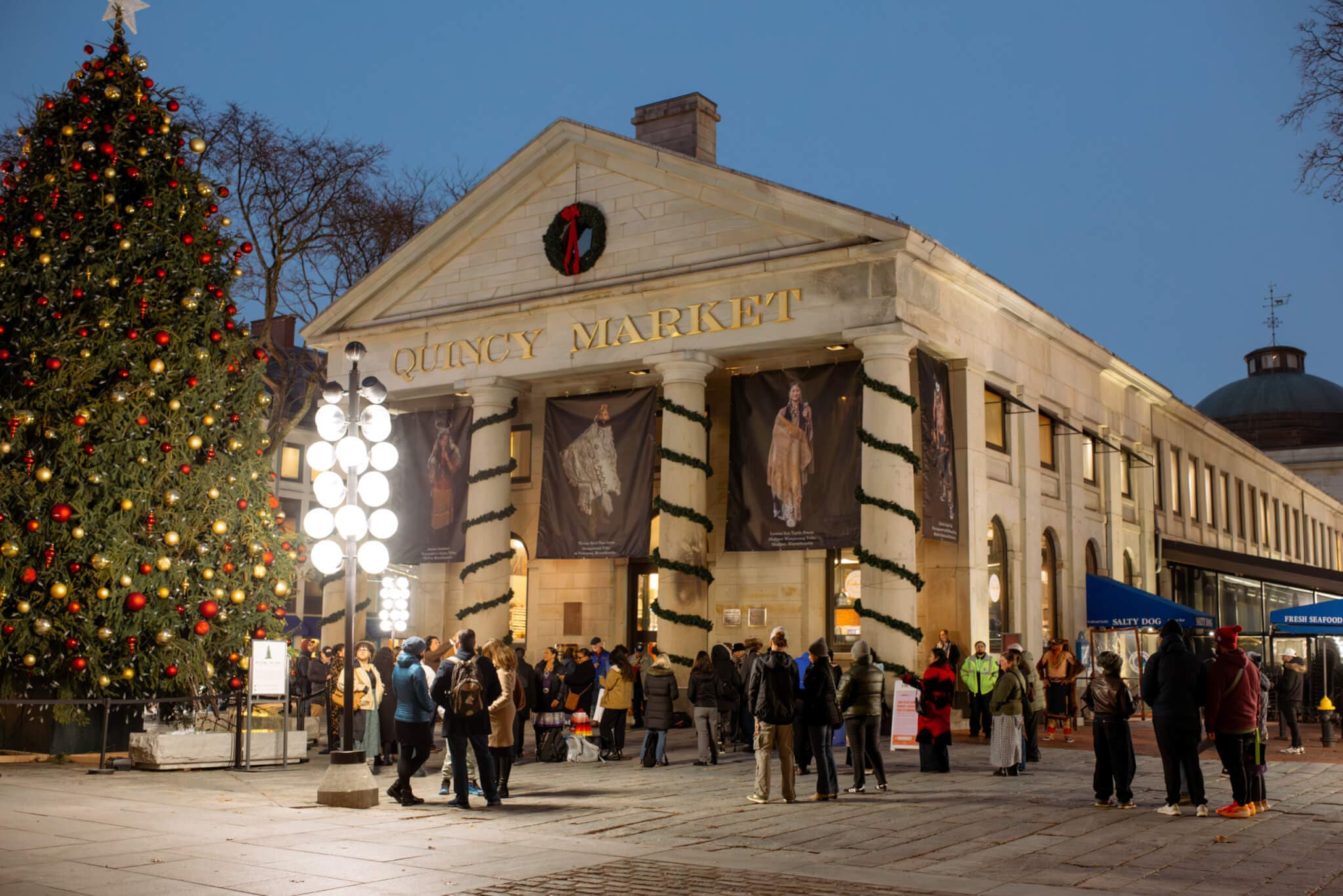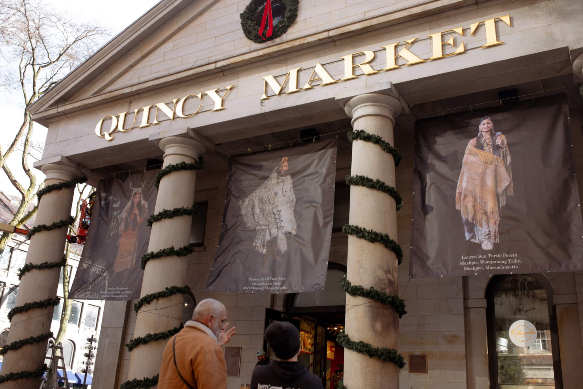 Above the main entrance to Quincy Market now hangs a towering portrait of Thomas Spirit Tree Green, tribal council member of the Massachusett tribe, the state’s namesake meaning “At the Great Hill.” Donning a storied deer cape gifted by the neighboring Nipmuc tribe, his gaze holds passersby.