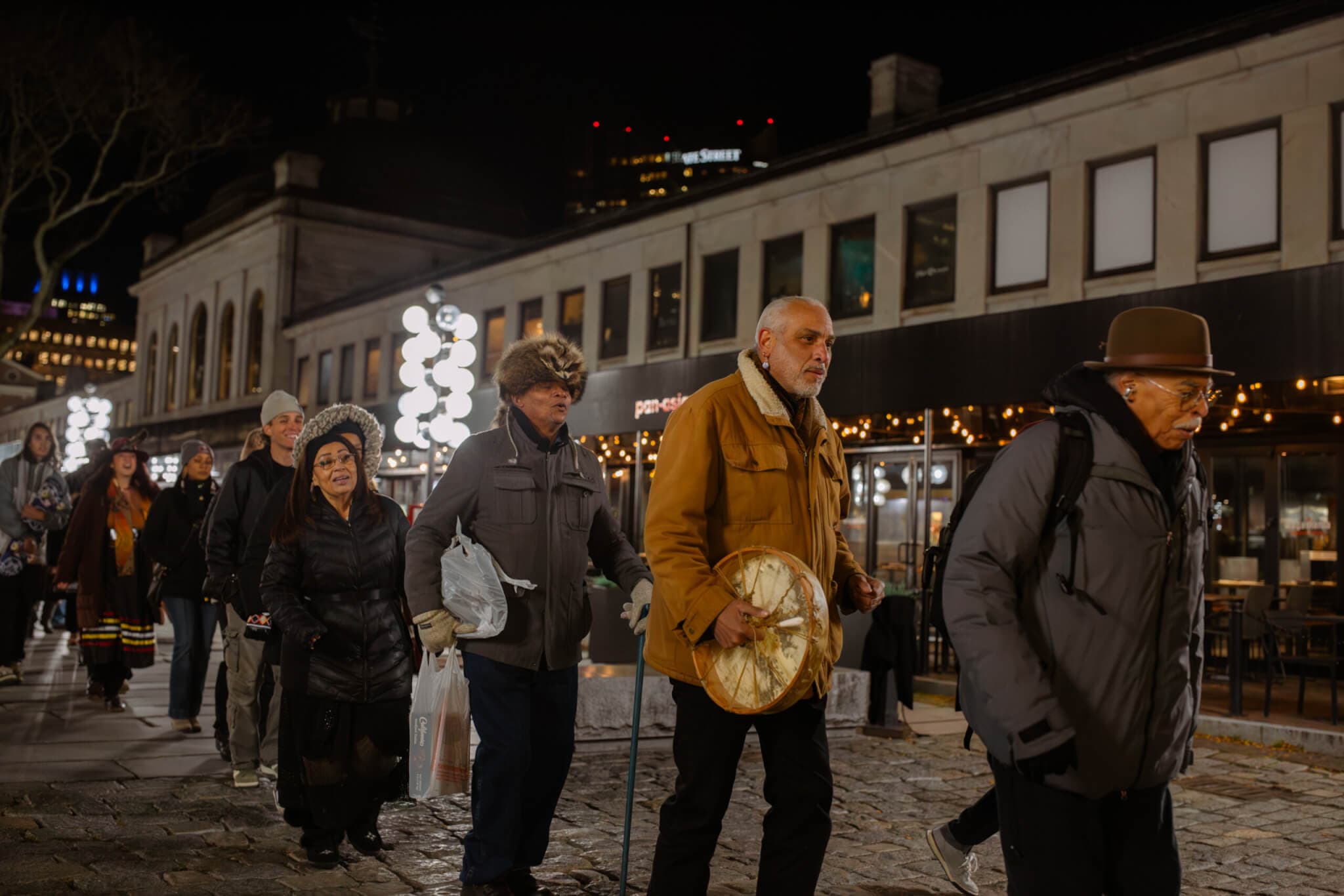 Attendees, past portrait subjects, and Scott Strong Hawk Foster engage in a stomp dance, singing along the length of Quincy Market to reach more portraits on its East side on the night of November 19, 2025. Photo by Marianna McMurdock.