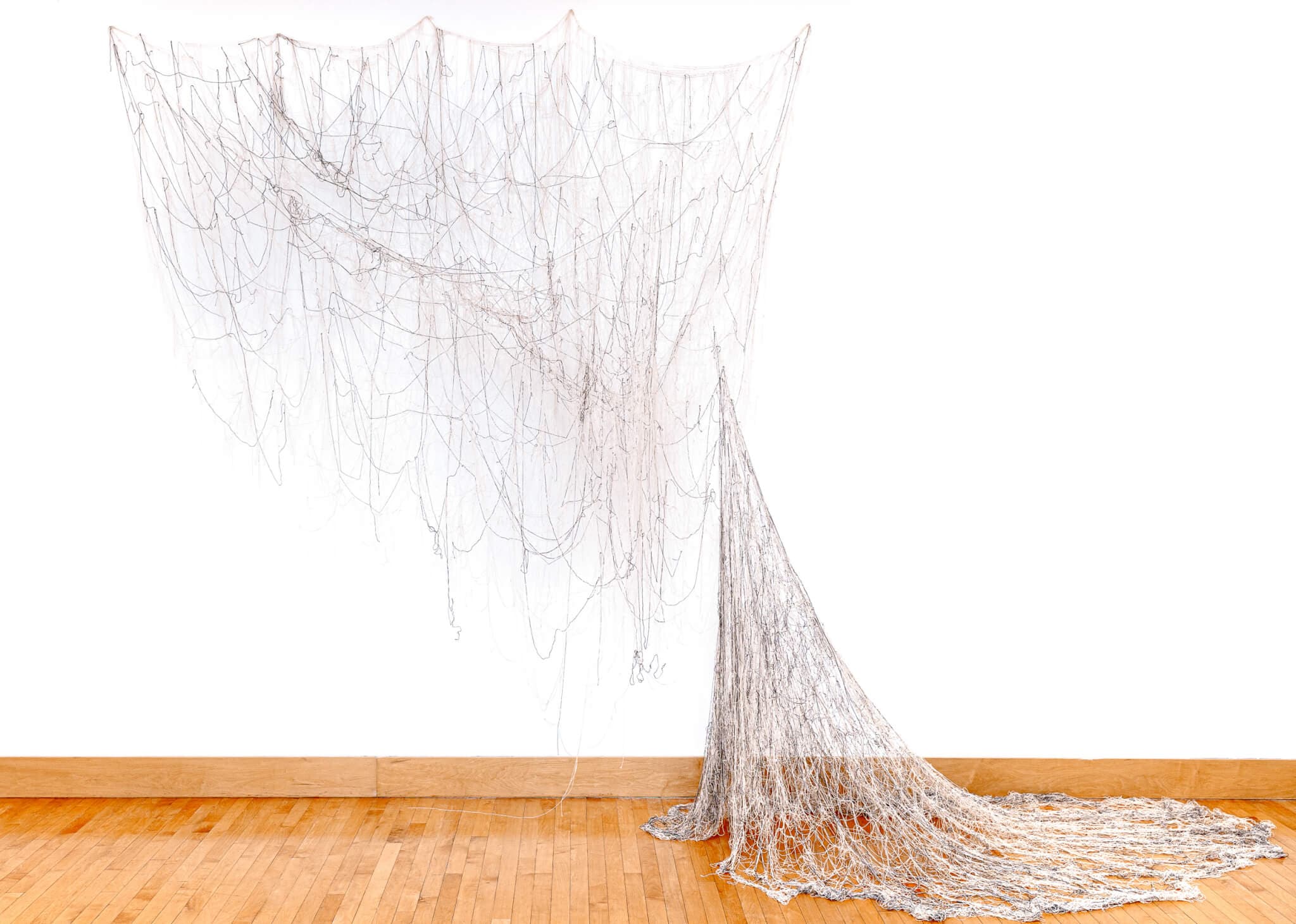 YS: Can you speak about your work Canvas (2023) that is currently on view at Merrimack College? It is such an interesting sculptural piece made from canvas. It seems like you are engaging with material that you worked with a lot in your early artistic career. We normally don’t see the presence of the canvas behind layers of paint, not to mention noticing the thread that made the canvas. But in this piece, you pull threads apart and lay them out front for us to see.