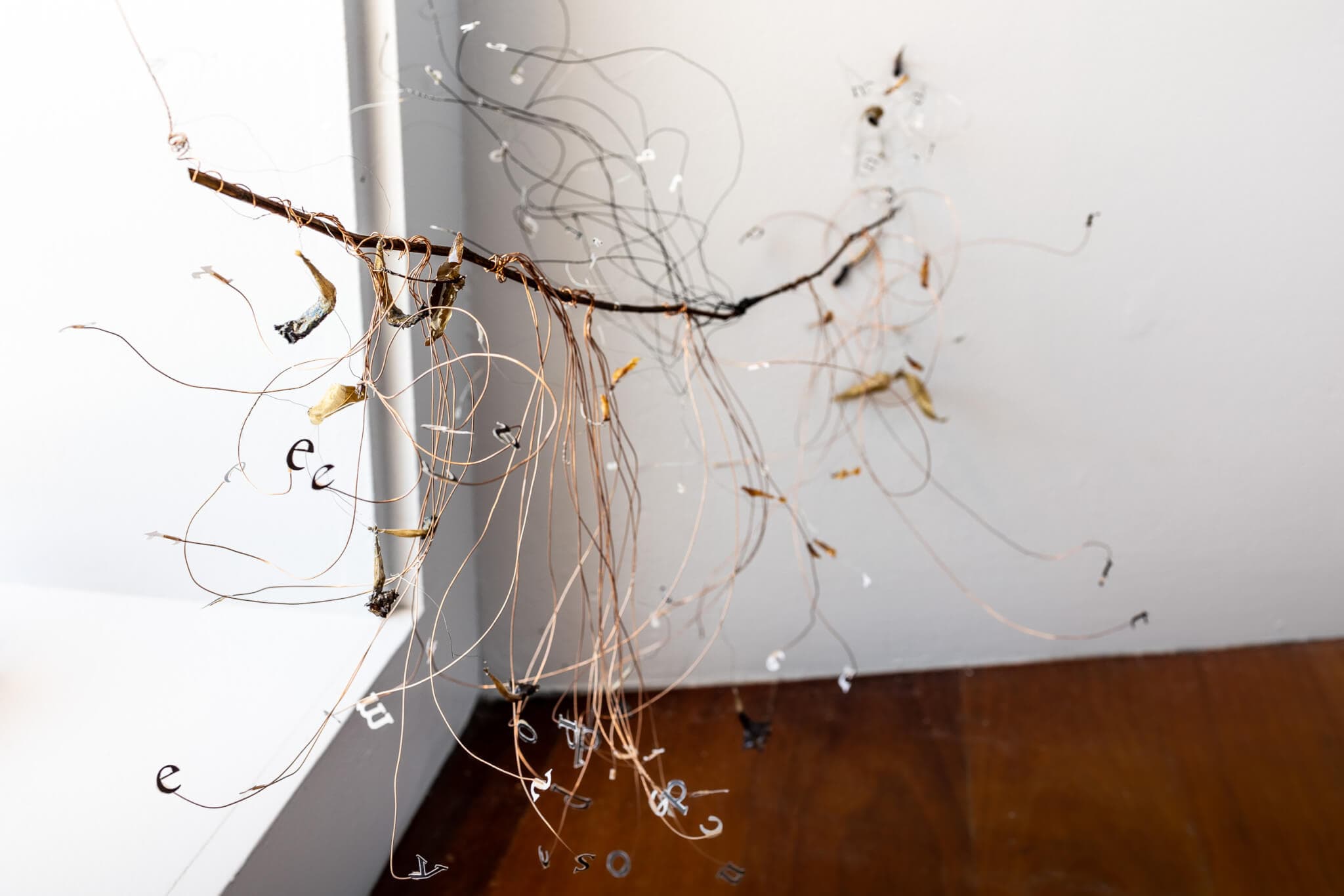 Jocelyn Shu, Chapter 17 (Parts I and II), 2021. Wire, cut text, glue, dried leaves and flowers in resin, tree branch. Installation dimensions variable (Part I: 30’ x 15’ x 12’, Part II: 60’ x 24’ x 12’). Installation view, “Jocelyn Shu: As I Came Home,” The LaunchPad at Boston Sculptors Gallery. Photo courtesy of the artist.