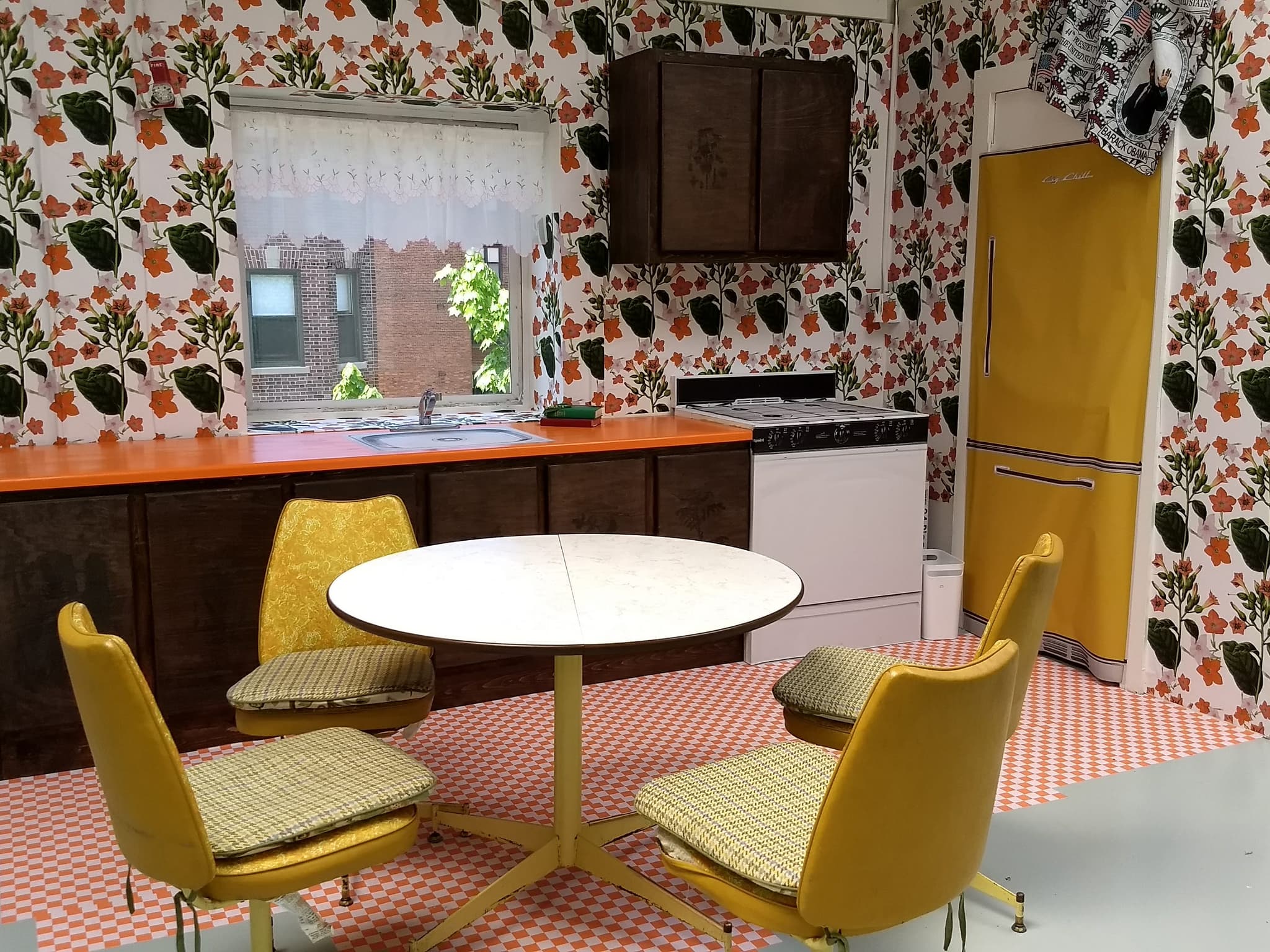 Ellie LaCourt’s deceptively simple and humorous animations confronting notions of ideal femininity and body image are mesmerizing to watch. Daniel Corral’s photographs of queer folks address issues of intimacy, identity and privacy. Utilizing the camera obscura method each large-scale photograph transports the viewer into a quiet space of cathedral-esque light and shadow cast across the subject’s body. On the night of the opening Salvadora McCaffrey, in a pink dress and apron, served up plates of soul food (turkey, collard greens, cornbread, etc.) to those who would sit at the kitchen table in her installation. A re-creation of her grandma’s kitchen—complete with 1970s era wallpaper, cabinets, orange counter tops, curtains and a checkered floor—her performance filled the gallery space with nostalgia, conversation, and the aroma of her grandma’s cooking. Though we couldn’t hear the conversation of the four people at the artist’s table, we did overhear one visitor ask, “How is this art?” Perhaps unaware that there is a long list of artists that make work centered around relational aesthetics and community engagement. One can only hope the conversation at McCaffery’s table was more interesting.