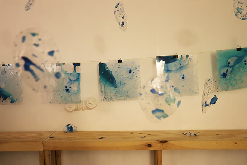 “Trace” relies on cloudy abstraction, splattered and diluted paint that transforms the surface of everyday materials. The effect is a saturated spontaneity, something between the permanence of the solid organic and the dissipation of water vapor. This fluidity is product of meditative repetition.